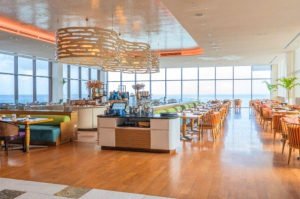 タモンの海を見渡せる開放的な広々とした店内で、豊富なビュッフェラインからお食事をお楽しみいただけます。
