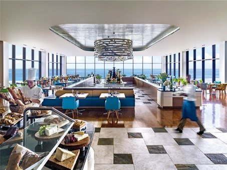 タモン湾を見張らせる広々としたスペースで豊富なビュッフェをお楽しみ頂けます。