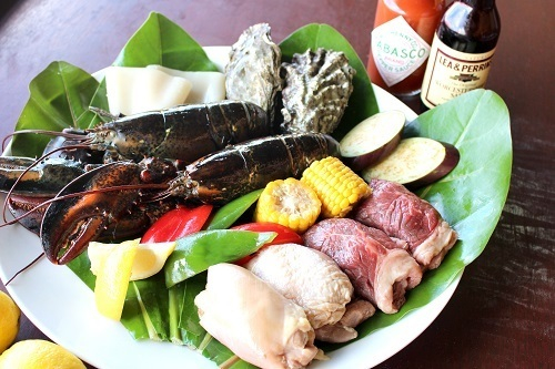 活ロブスター、サーロインステーキ、チキン、オイスター、野菜、飲み放題(生ビール、ワイン、チャモロパンチ、アイスティー、ソーダ)