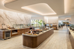 ローカルフードからアメリカンスタイルの料理まで幅広く楽しめるインターナショナルビュッフェレストラン「ザ テラス(The Terrace)」。ランチビュッフェ、サンデーブランチ、ディナービュッフェをお楽しみいただけます。サンデーブランチとディナービュッフェは各種アルコール類が飲み放題です。レストラン内にはベーカリーとペストリーショップが併設されており、焼きたてのパンやペストリー、デザートもお楽しみいただけます。スタイリッシュな店内、緑豊かな庭園とタモンビーチを一望できる贅沢なロケーションも魅力のひとつです。